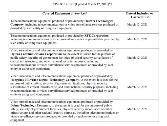 當地時間3月12日,美國聯邦通信委員會(FCC)發佈第一批不可信供應商名單,包括中興、華為、海能達、海康威視、大華科技五家中國企業