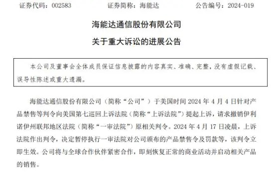 海能達發佈公告:上訴法院決定暫停執行一審對海能達頒佈的產品禁售令罰款等,即刻恢復正常商業活動並啓動相關產品的銷售