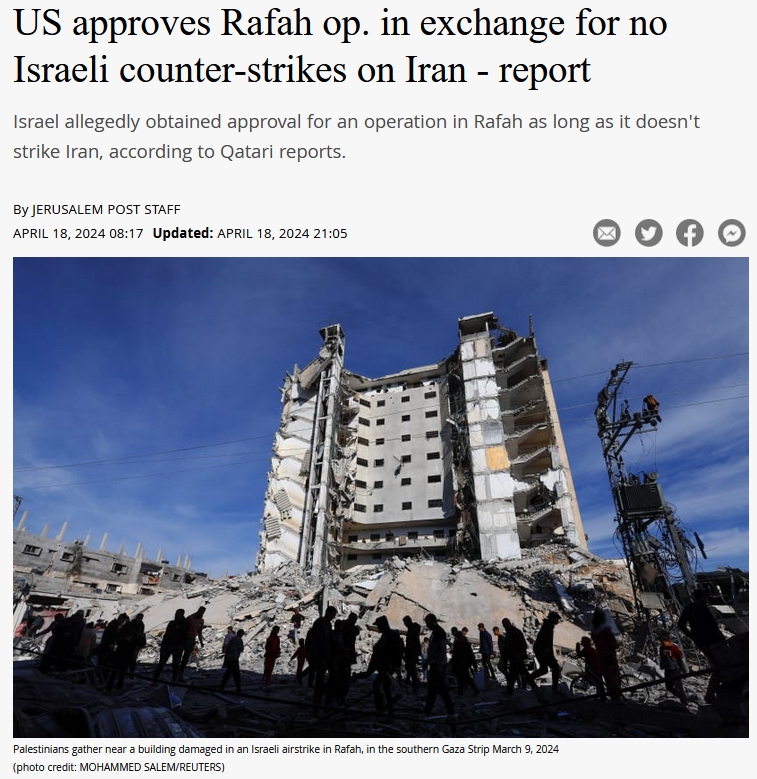 美國同意以色列軍隊在加沙地帶南部城市拉法開展地面行動,換取以方承諾不對伊朗採取大規模反擊(圖片來源:外媒報道截圖)