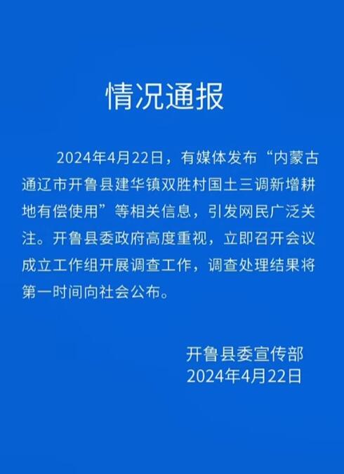 2024年4月22日,有媒體發佈“內蒙古通遼市開魯縣建華鎮雙勝村國土三調新增耕地有償使用”等相關信息,引發網民廣泛關注。開魯縣委政府高度重視,立即召開會議成立工作組開展調查工作,調查處理結果將第一時間向社會公佈。