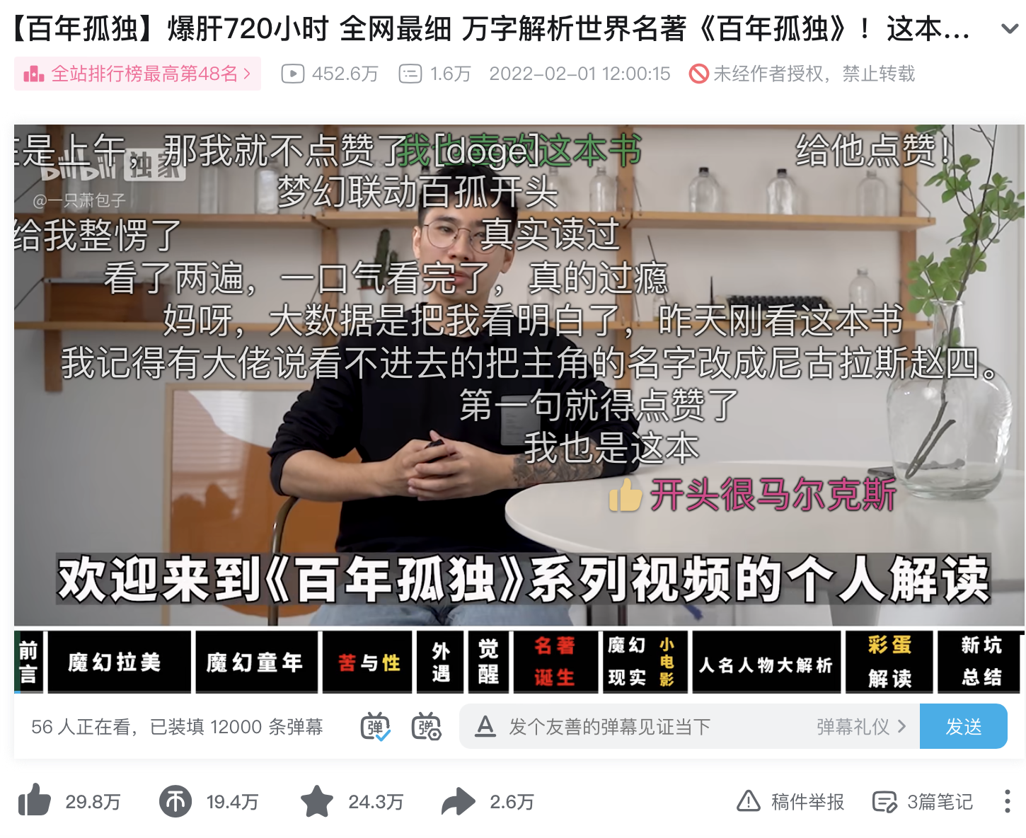 如B站UP主一隻蕭包子創作的“《百年孤獨》系列合集”,將晦澀難懂,人物圖譜複雜的故事,講述的通俗易懂。截至目前,全系列收穫了992.1萬的總閲讀,最高單篇點贊達到了29.8萬,收穫大量用户催更,“看不懂的《百年孤獨》終於看懂了,希望作者能以此為例將《巴黎聖母院》等作品逐一進行解讀”。