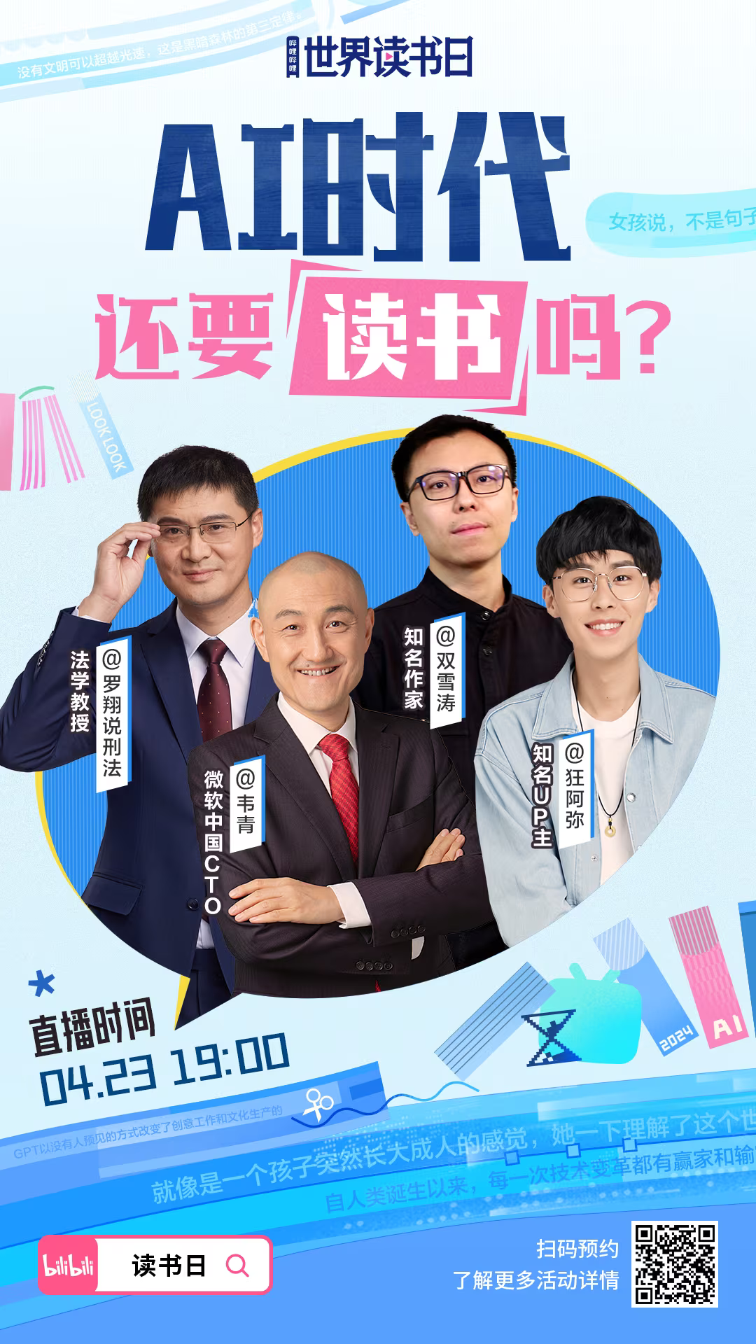 4月23日,在世界讀書日之際,B站推出了悦讀季活動,聯合UP主羅翔、UP主狂阿彌、微軟中國CTO韋青、知名作家雙雪濤,在4月23日晚推出主題直播,探討“ChatGPT時代,人們還需要閲讀嗎?”等前沿話題。