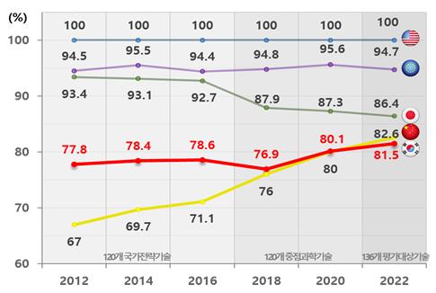 韓科技部評估認為,通過分析11個科技領域136項關鍵技術,若將美國的發展水平視為100%,中國則為82.6%,韓國為81.5%。這是2012年以來,中國首次在韓政府發佈的科技水平榜單中領先韓國。