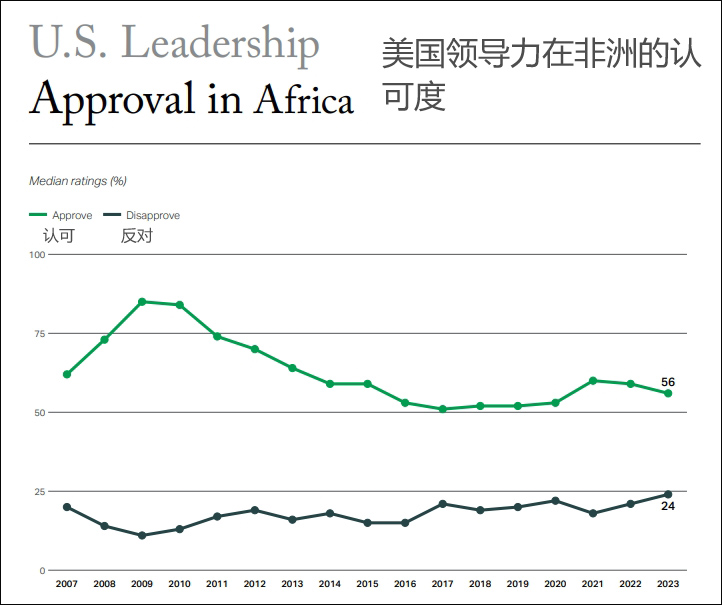 在非洲,對美國領導地位的認可率中位數略有下降至56%,落後於中國的58%;反對率自2021年以來持續上升,達到24%。俄羅斯領導力在非洲的認可率中位數為42%,比上一年高出8個百分點,與2021年俄烏衝突爆發前持平。