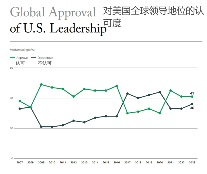 這項民意調查受訪者覆蓋了全球134個國家和地區15歲以上人羣。調查結果顯示,儘管從2022年到2023年,美國領導力的認可率中位數穩定在41%,與2022年持平,低於2021年,但反對率已從2022年的33%攀升至2023年的36%。