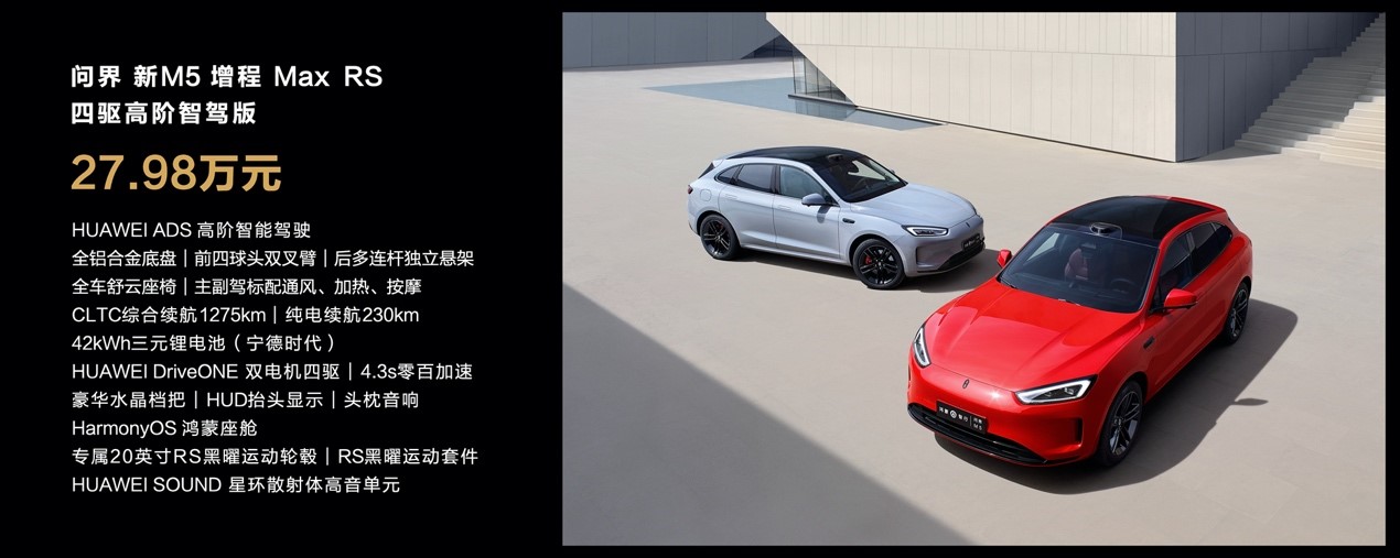 問界新M5系列售價和首銷期權益已經公佈——問界新M5增程Max後驅高階智駕版24.98萬、問界新M5純電Max後驅高階智駕版26.98萬,問界新M5增程Max RS四驅高階智駕版27.98萬。即刻下定,可享受價值3.7萬的選配權益 ,包括3000元現金優惠,贈送價值12000元選配金,贈送價值20000元城區智駕包等額抵扣券,提車後贈送價值2000元前擋風玻璃隔熱膜,並將於5月15日開始批量交付。