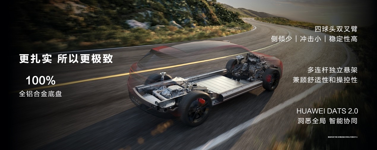 問界新M5採用華為自研HUAWEI DATS 2.0(Dynamic Adaptive Torque System,動態自適應扭矩系統)、前四球頭雙叉臂、後多連桿獨立懸架與同級領先的全鋁合金底盤,用料超下本,體驗更極致。根據實測數據 ,問界新M5的100-0km/h制動距離為35.58m,麋鹿測試成績提升至79km/h,為駕駛者帶來更加酣暢淋漓的駕趣體驗。