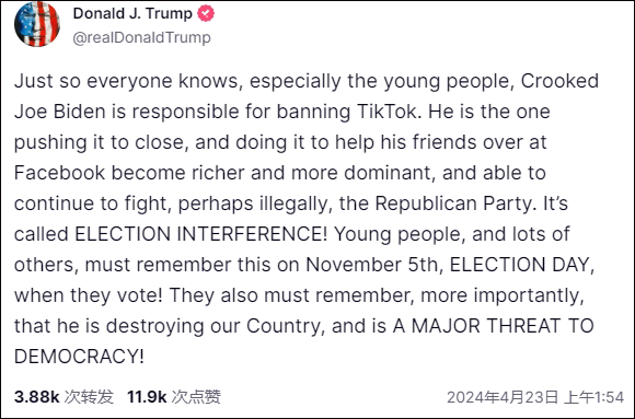 “所有人都清楚,尤其是年輕人,騙子喬·拜登要為禁止TikTok負責,”特朗普在自創社交媒體平台“真相社交”發文,批評拜登進行“選舉干預”,因為他推動封禁TikTok的行為是為了“幫助他在Facebook的朋友變得更加富有、更有統治力,並且能夠繼續與共和黨抗爭”。