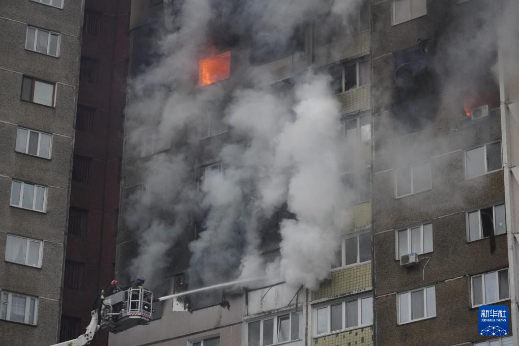 2月7日,消防員在烏克蘭基輔為被導彈碎片擊中的居民樓滅火。(圖/新華社)
