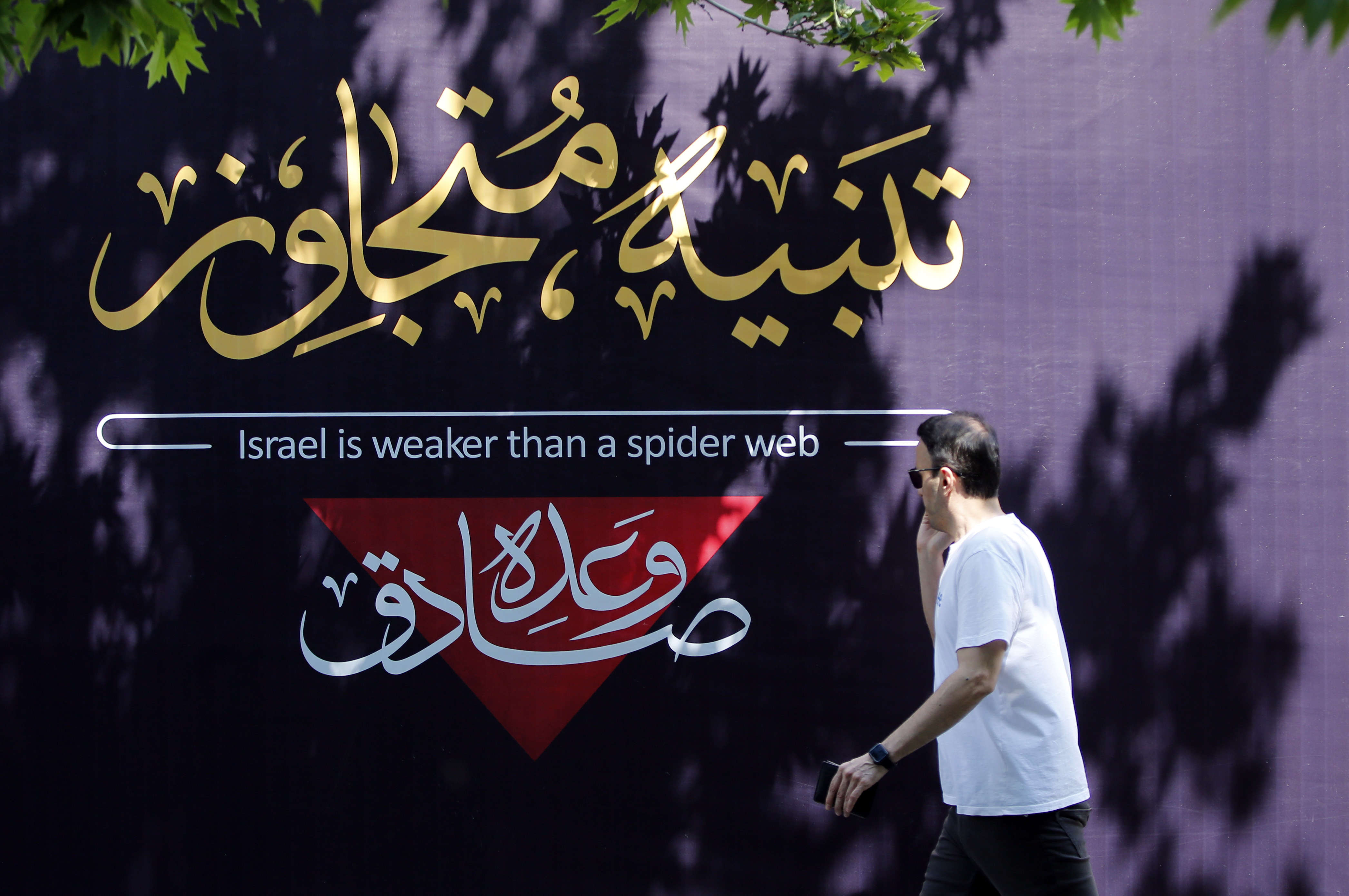 伊朗德黑蘭街頭宣傳語向民眾傳達表示“以色列比蜘蛛網還脆弱”,圖源:epa/東方IC