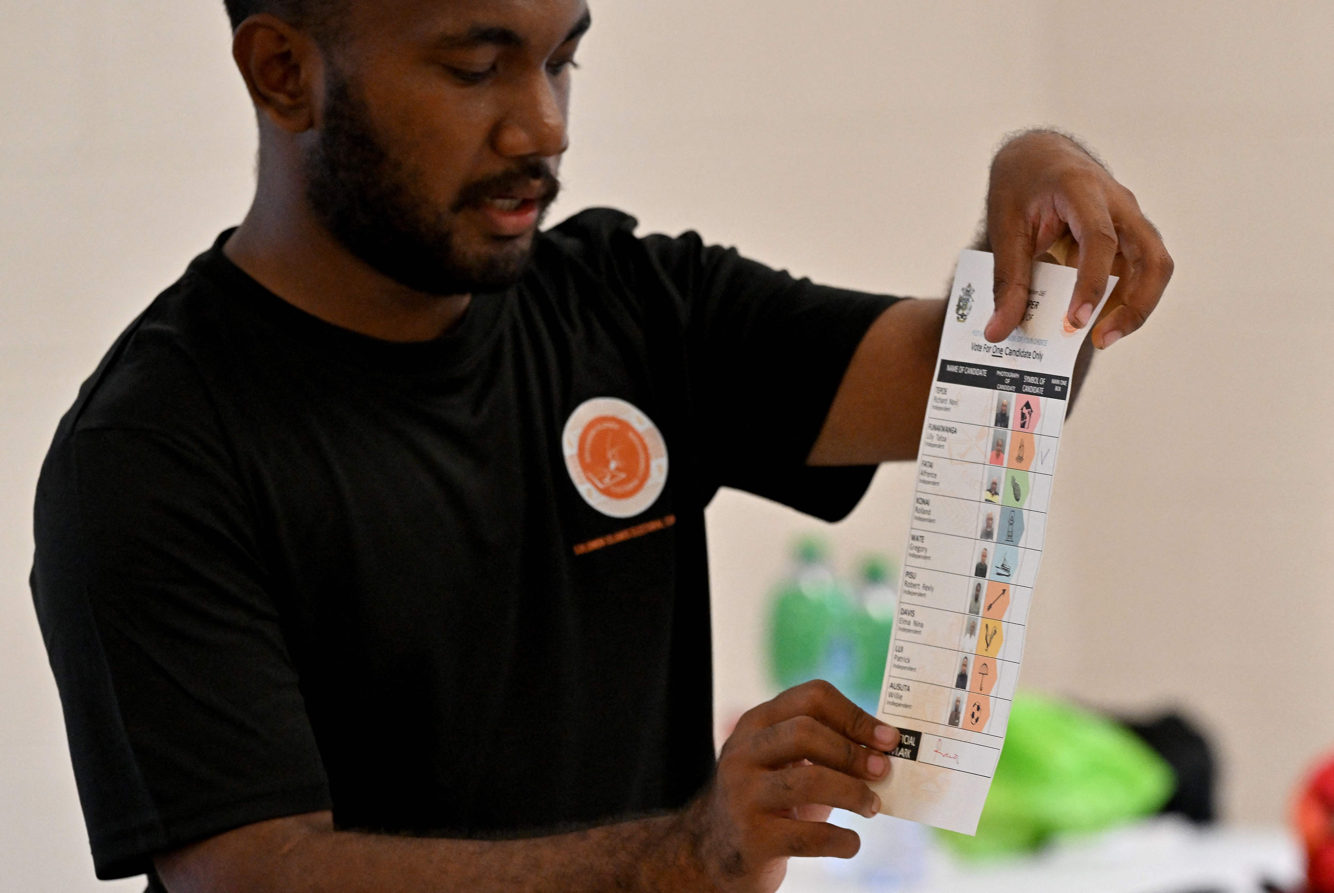 當地時間2024年4月19日,所羅門羣島霍尼亞拉,一名選舉官員在清點選票時展示選票 /新華視覺
