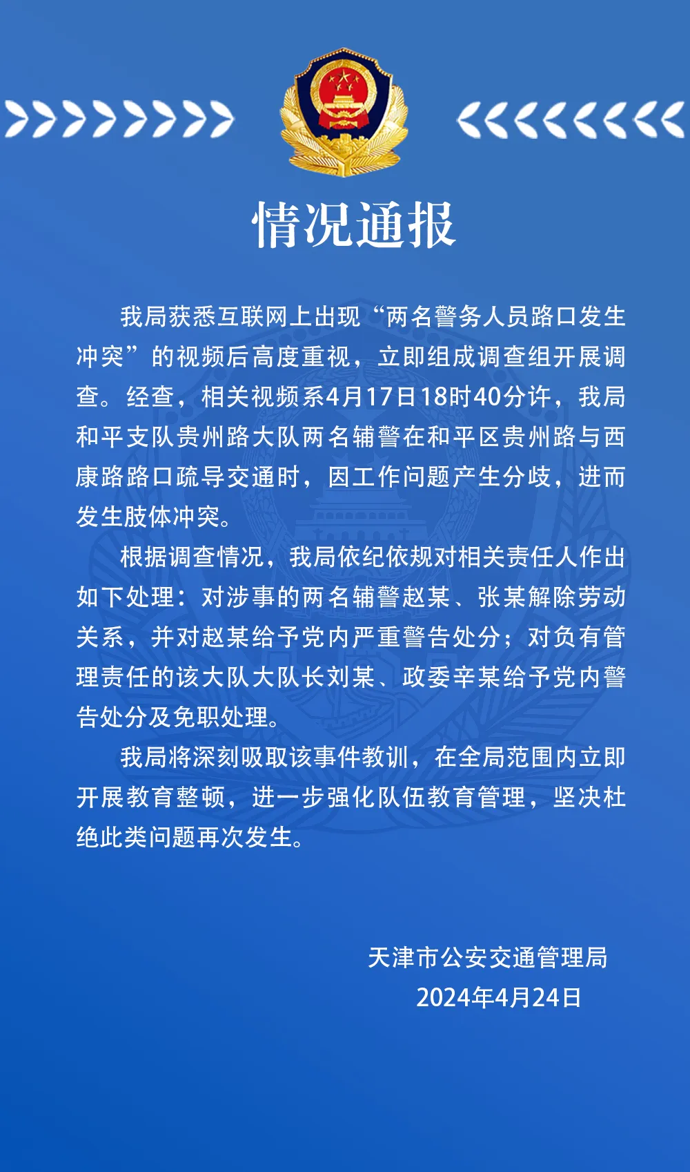 我局獲悉互聯網上出現“兩名警務人員路口發生衝突”的視頻後高度重視,立即組成調查組開展調查。經查,相關視頻系4月17日18時40分許,我局和平支隊貴州路大隊兩名輔警在和平區貴州路與西康路路口疏導交通時,因工作問題產生分歧,進而發生肢體衝突。