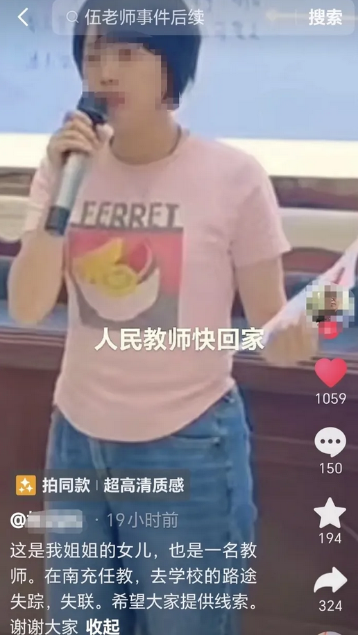 視頻發佈者稱,失蹤的女教師是他姐姐的女兒,今年二十多歲,已婚有孩子。
