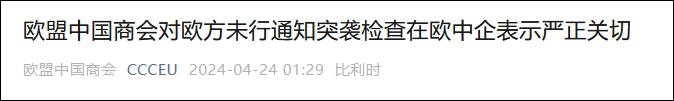 “歐盟中國商會對歐委會及有關方面未行通知突襲檢查中企在歐盟設立的公司的行為表示嚴正關切。”聲明寫道,“歐盟中國商會和廣大在歐中企對23日發生的這起事件表示震驚和不滿。”