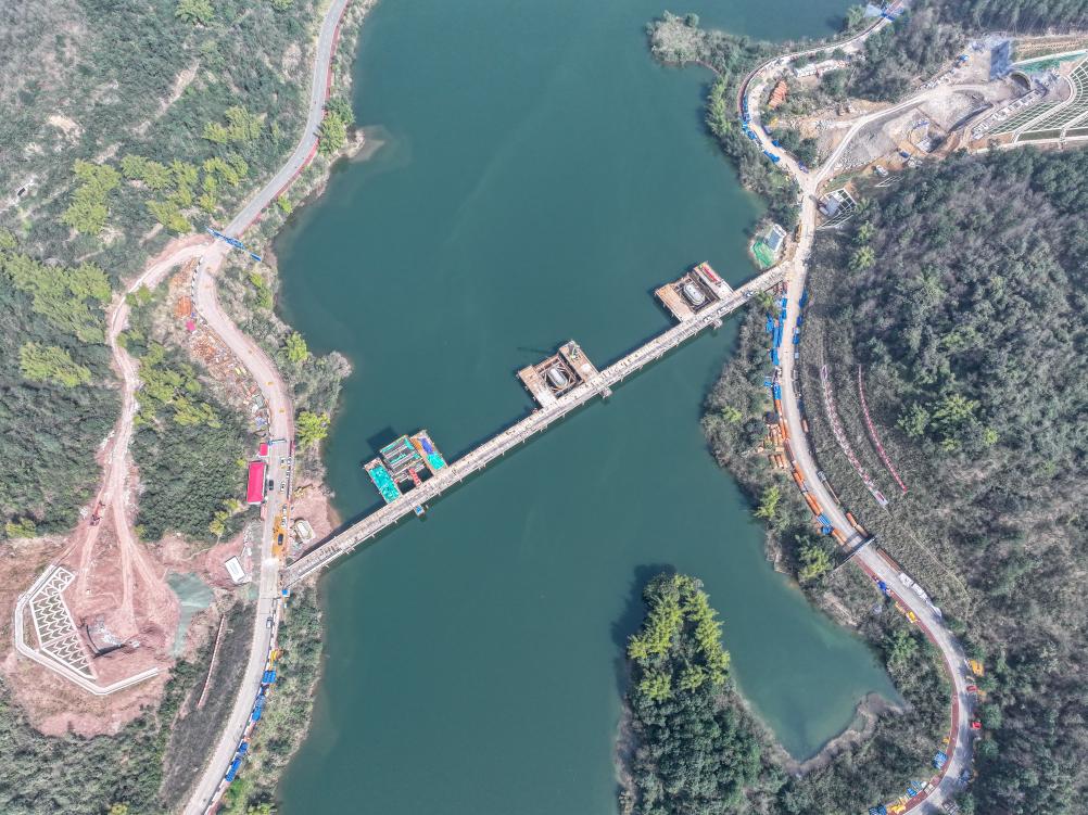 這是2月19日拍攝的位於重慶市銅梁區的成渝中線高鐵玄天湖大橋建設現場(無人機照片)。新華社記者 唐奕 攝