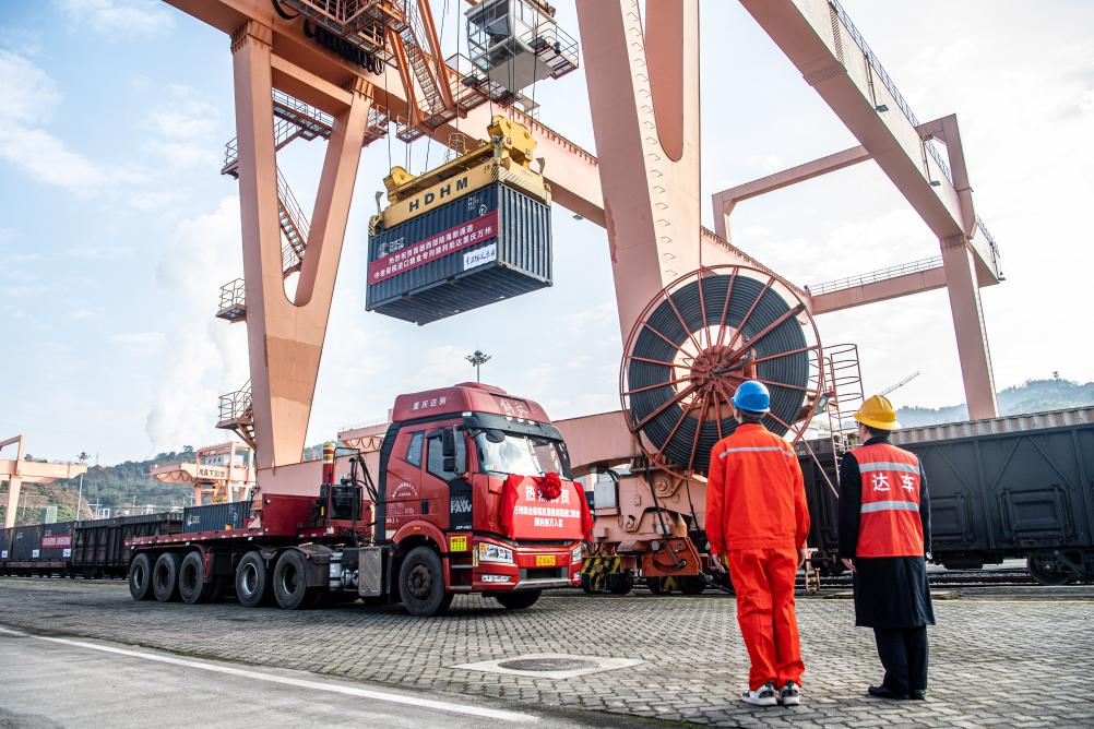 1月4日,在重慶萬州新田港站,工作人員進行集裝箱吊裝作業,將專列貨物轉運至公路物流環節。新華社記者 唐奕 攝