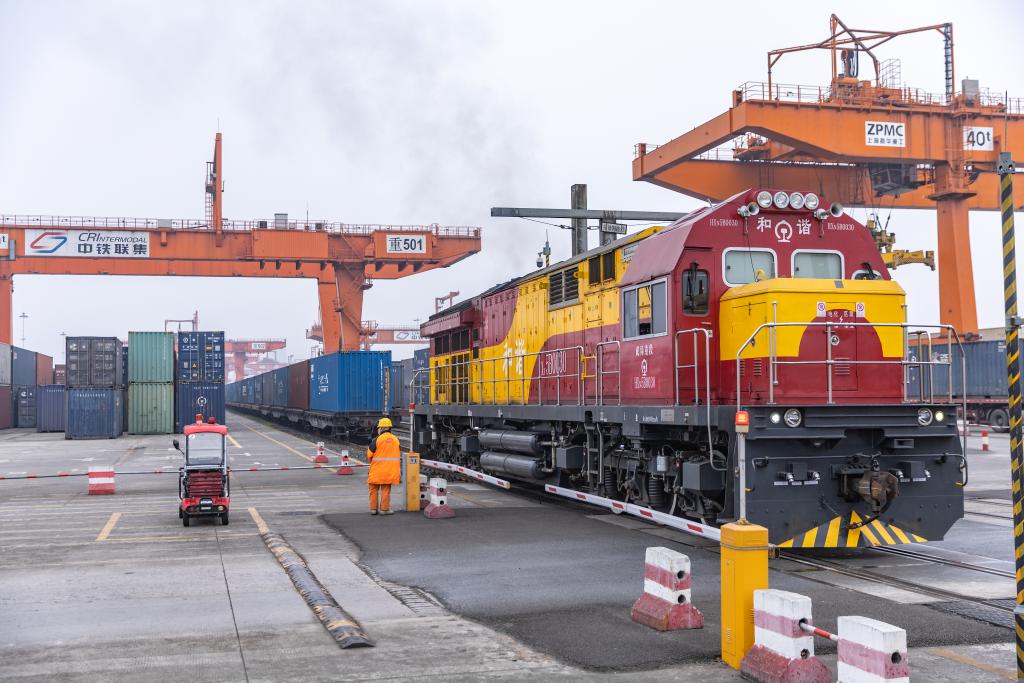 3月7日,一列滿載機械設備、整車及零部件等貨物的中歐班列在重慶團結村中心站等候發車。新華社記者 黃偉 攝