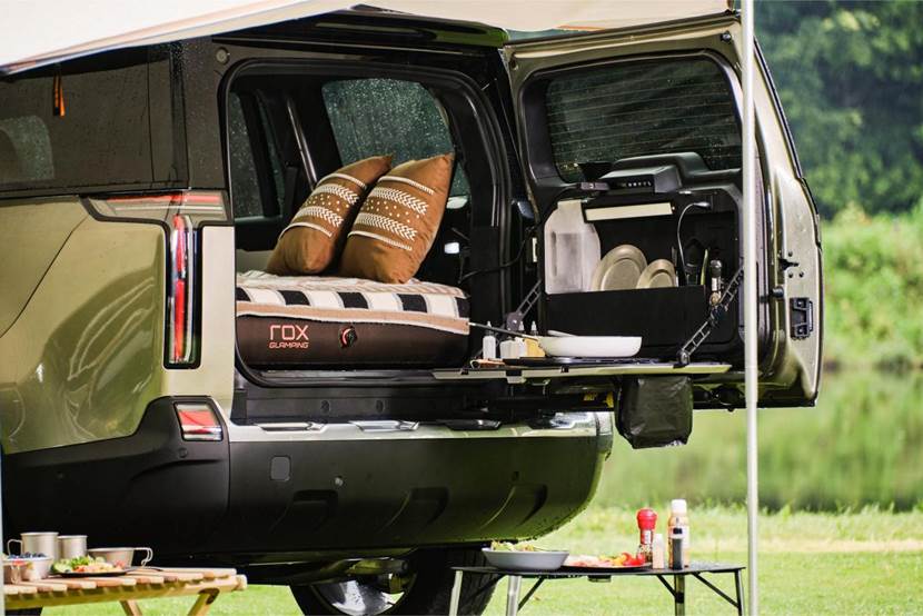 對於熱愛露營的玩家而言,極石01能夠在配件系統的支持下化身百變房車,進一步拓展旅途中的萬千精彩。業界首創的車載尾門廚房系統自帶照明操作枱,220V供電、直飲熱水、操作枱、儲物收納等一應俱全,美食創意隨心發揮。7座車型可以快速放倒二、三排座椅,配合定製牀墊變成一張2米×1.3米的全平大牀。支起車邊帳,13平米户外客廳勾勒出的無限可能,也在天地之間徐徐展開。
