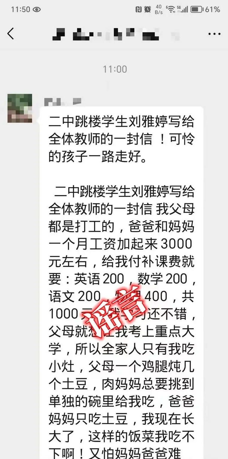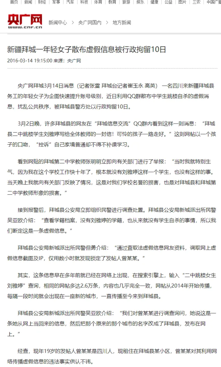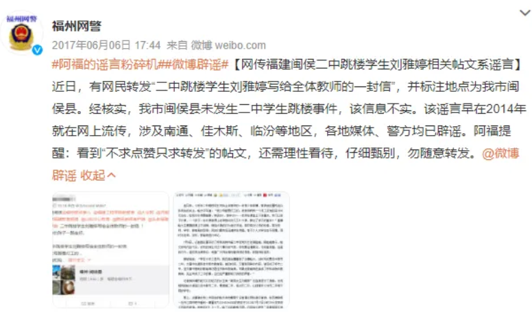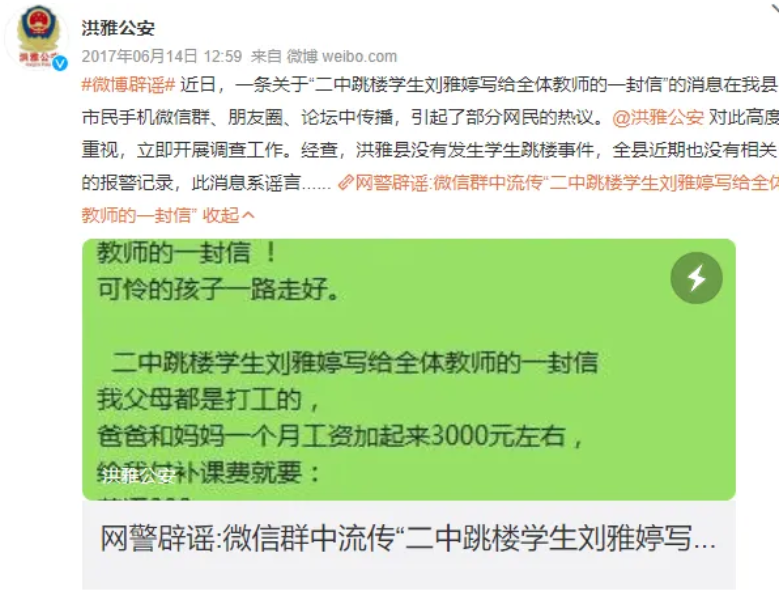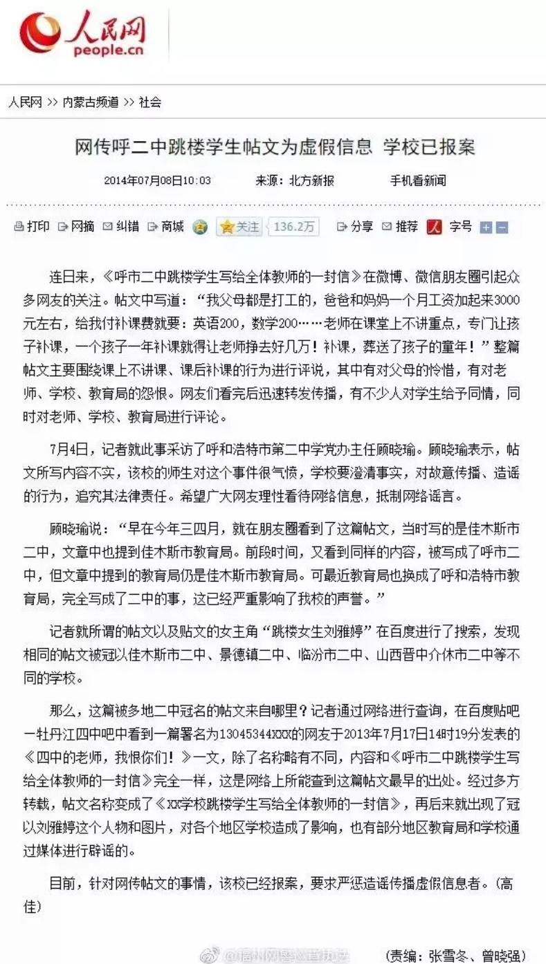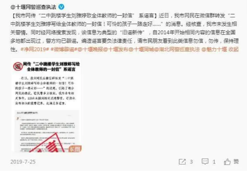 警方進一步調查發現,“二中學跳樓學生劉雅婷寫給全體教師的一封信”這類謠言多為舊謠新炒。早在2014年,該內容就被冠以各地二中在網上出現,各地也紛紛闢謠。