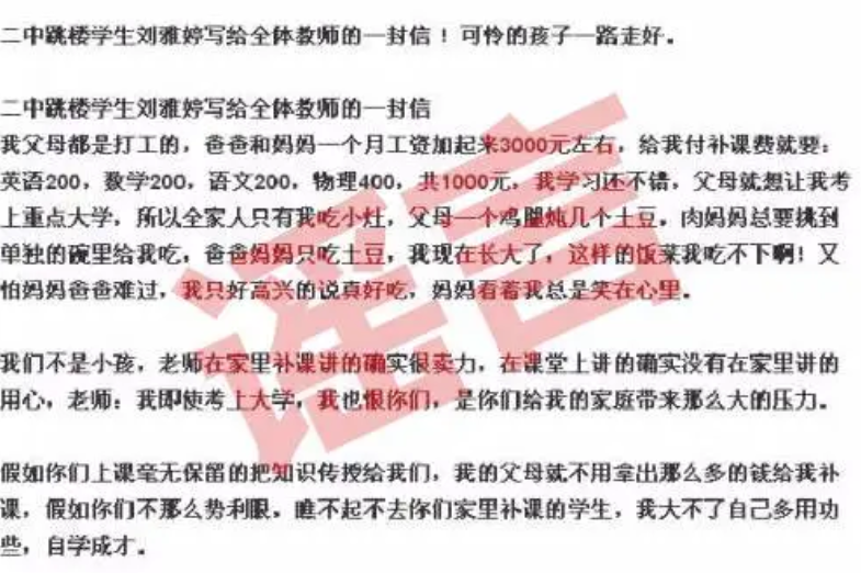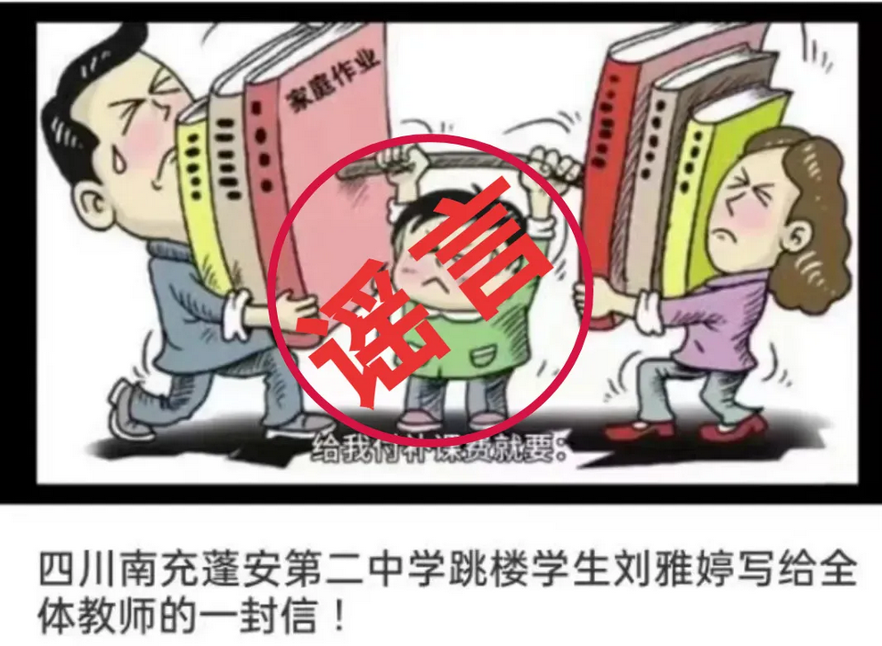 3月29日,四川南充蓬安二中相關負責人向當地警方報案,稱有平台自媒體發佈短視頻,標題為“四川南充蓬安第二中學跳樓學生劉雅婷寫給全體教師的一封信,可憐的孩子一路走好”。