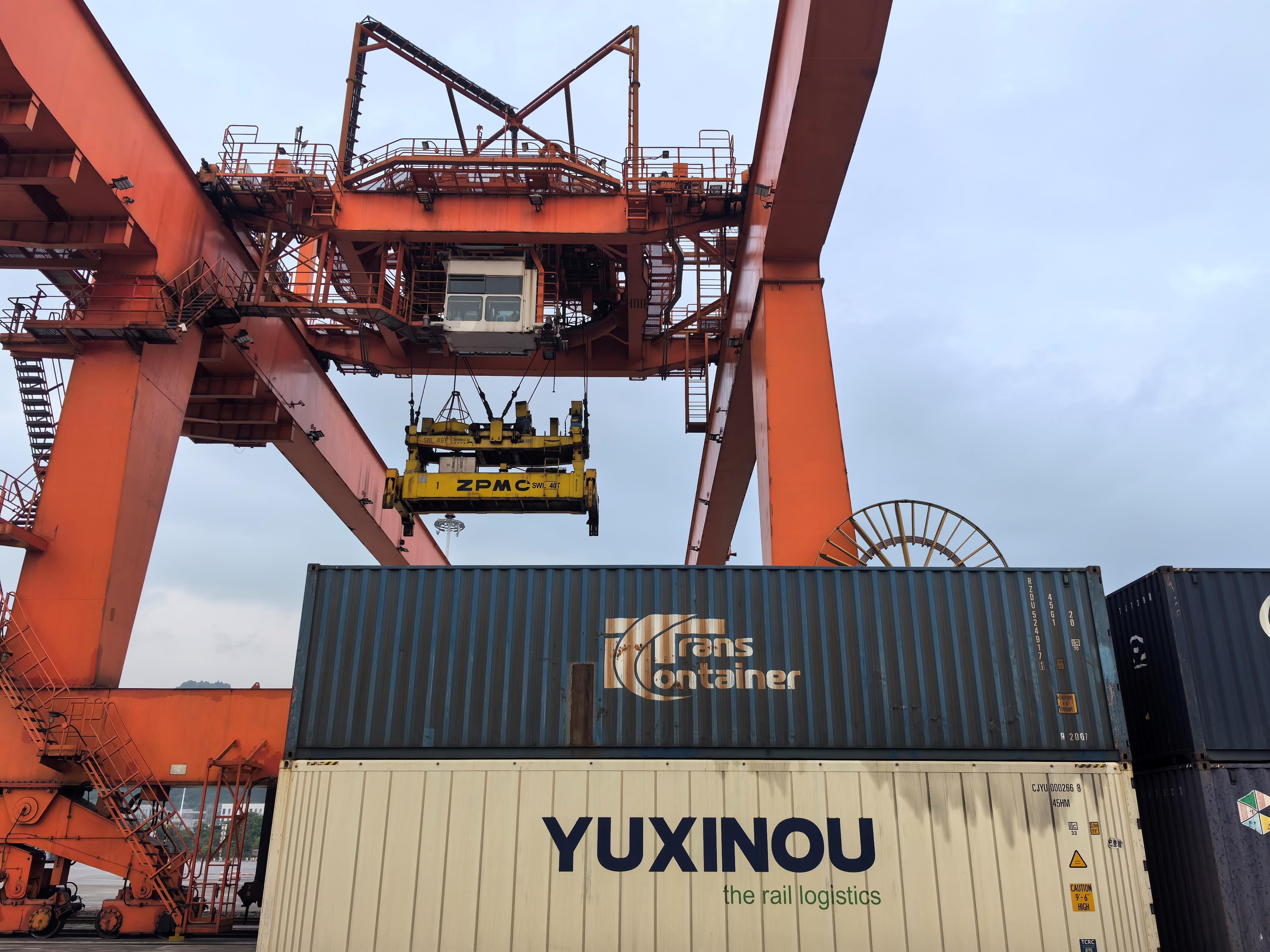 △重慶國際物流樞紐園區內,中歐班列運送的“渝新歐”集裝箱整齊排列。(總枱央廣記者潘毅拍攝)