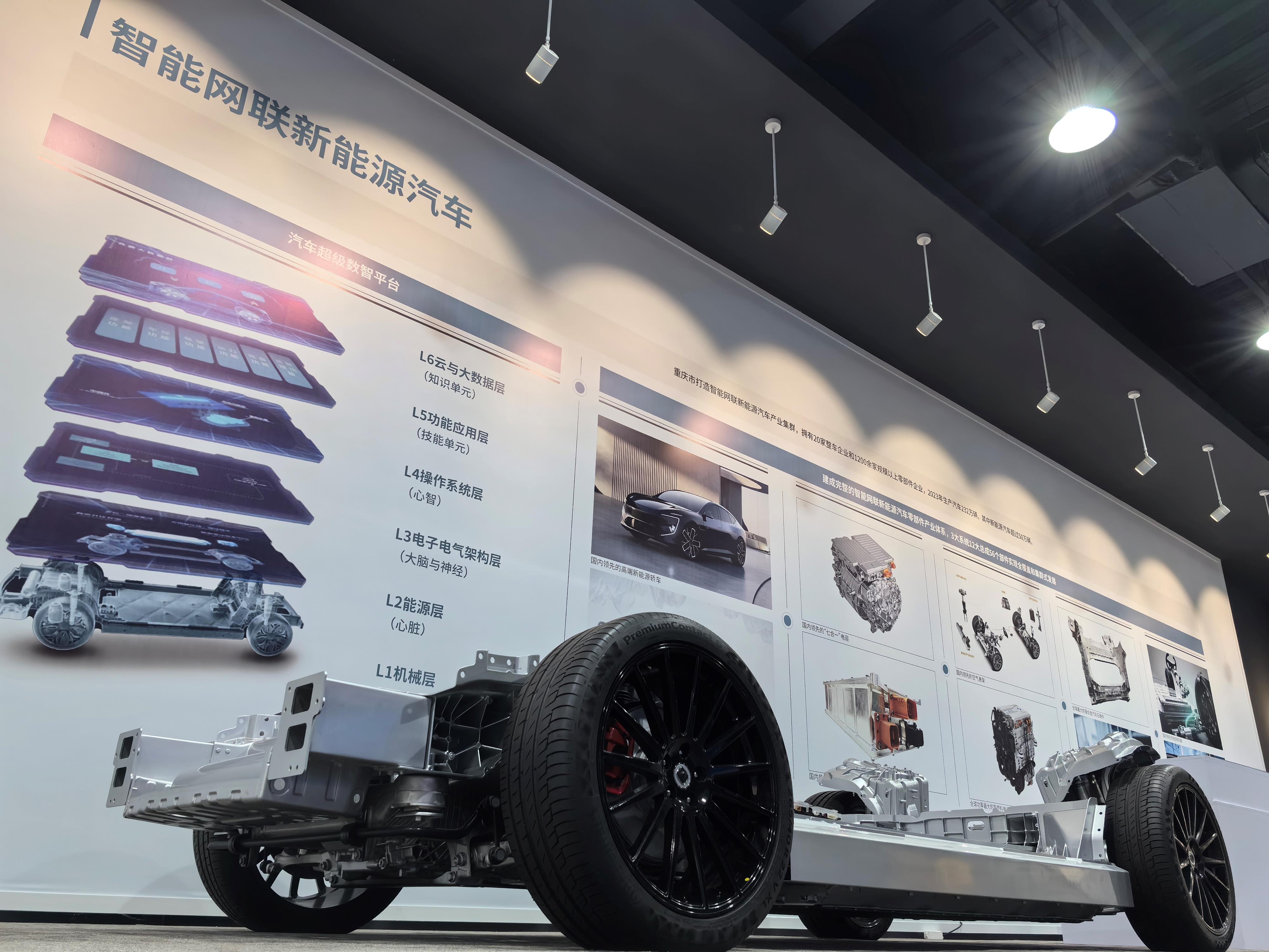 △在重慶市科技創新和產業發展成果展示上的智能網聯新能源汽車部件。(總枱央廣記者潘毅拍攝)