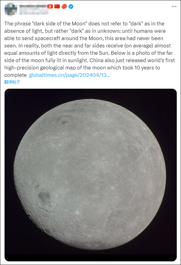 另一個網名中帶有中國國旗和香港特區區旗的天文愛好者,也轉述了尼爾森的問答內容,併發文科普稱,“月球陰暗面”這個短語並不是指沒有光的“黑暗”,而是指未知的“黑暗”,即在人類能夠發射環繞月球的航天器之前,這個地區從未被看到過。實際上,近地面和遠地面平均接收到的直接陽光幾乎相等。