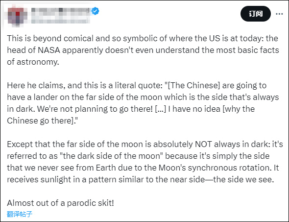“這實在太可笑了,而且非常具有象徵意義,反映了美國今天的狀況:NASA局長甚至都不懂最基本的天文學知識。”一名個人認證為企業家的網網民在X平台複述了尼爾森的這段問答,並指出,月球的另一邊絕對不總是黑暗的,它被稱為“月球暗面”,是因為月球的同步自轉,它只是我們從地球上看不到的那一邊,它接收陽光的模式與我們看到的近側相似。