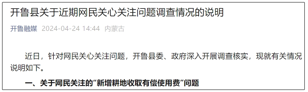 微信公眾號“開魯融媒”4月24日發佈“開魯縣關於近期網民關心關注問題調查情況的説明: