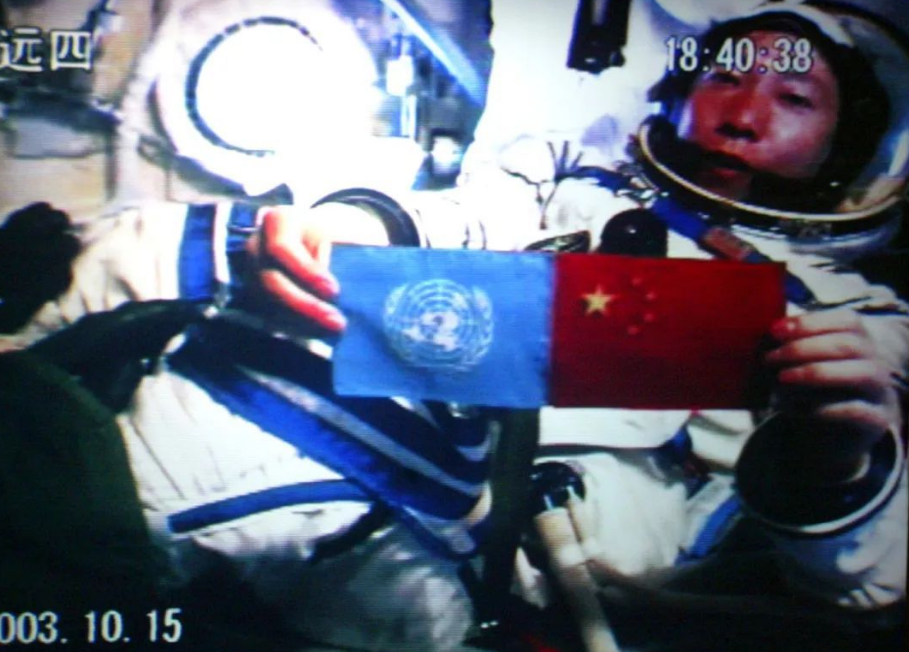 2003年10月15日,神舟五號載人飛船成功發射,楊利偉成為第一位造訪太空的中國人,中國也成為世界上第三個獨立掌握載人航天技術的國家。楊利偉從太空向世界各國人民問好,並在艙內並列展示了五星紅旗和聯合國旗。這個畫面載入史冊。