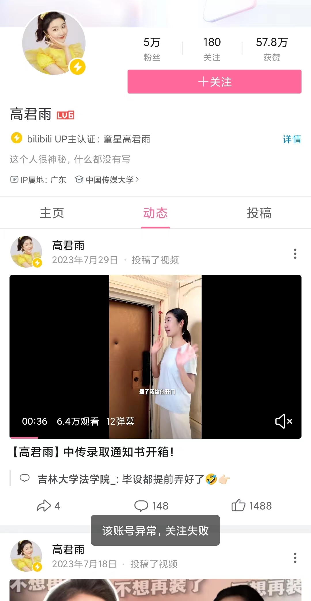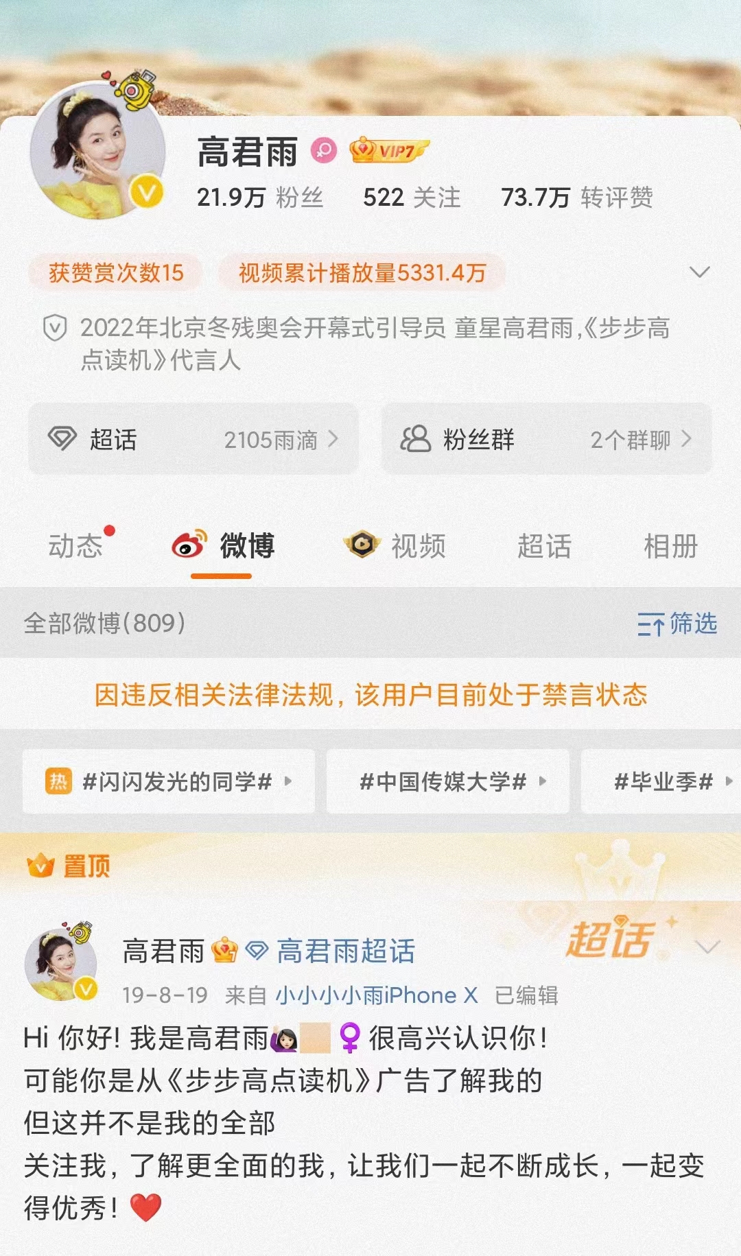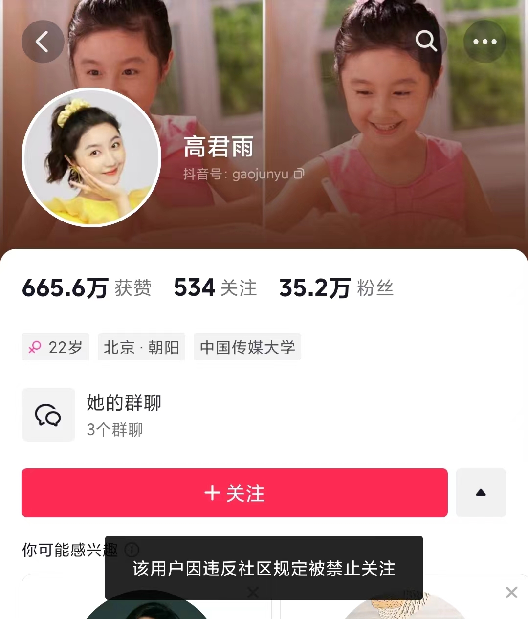 4月24日,《步步高點讀機》代言人、童星高君雨在微博、小紅書等多個平台的賬號顯示“因違反相關法律法規,該用户目前處於禁言狀態”,而高君雨的抖音和B站賬號雖未直接標註被禁言,但在點擊關注的時候彈出“賬號異常,禁止關注”的相關提示。