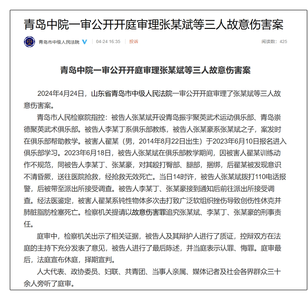 @青島市中級人民法院 4月24日消息,2024年4月24日,山東省青島市中級人民法院一審公開開庭審理了張某斌等三人故意傷害案。