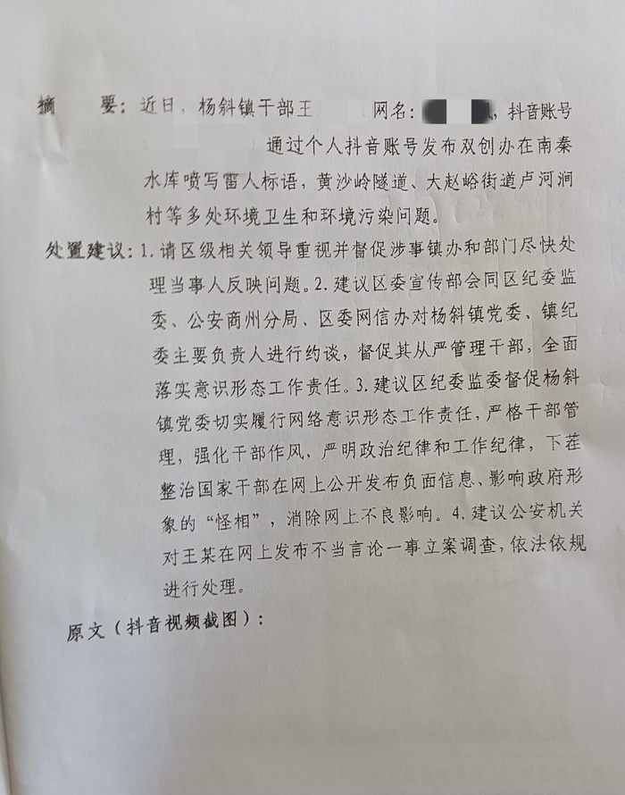 據上述“輿情快報”顯示,其發文時間為4月23日,標題為《關於楊斜鎮幹部發佈負面視頻的輿情信息》。文件“摘要”顯示,“近日,楊斜鎮幹部王某某通過個人抖音賬號發佈雙創辦在南秦水庫噴寫雷人標語,黃沙嶺隧道、大趙峪街道盧河澗村等多處環境衞生和環境污染問題”。相關“處置建議”為:“請區級相關領導重視並督促涉事鎮辦和部門儘快處理當事人反映問題;建議區委宣傳部會同區紀委監委、公安商州分局等對該鎮黨委、紀委主要負責人進行約談,督促其從嚴管理幹部等;建議區紀委監委督促該鎮黨委嚴格幹部管理,整治國家幹部在網上公開發布負面信息等;建議公安機關對王某某在網上發佈不當言論一事立案調查,依法依規進行處理。”