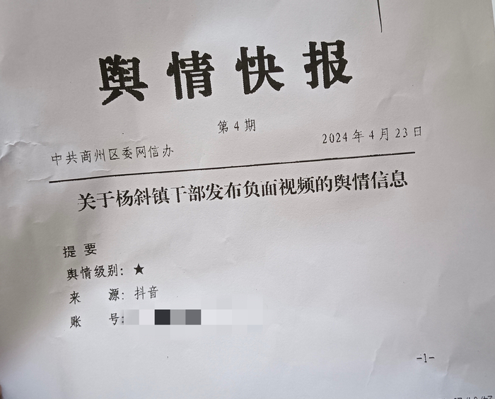 4月24日,一份出自陝西省商洛市商州區委網信辦的“輿情快報”(第4期)在網絡上流傳,引發網友廣泛關注。據該“輿情快報”顯示:針對當地楊斜鎮幹部王某某通過個人抖音號發佈當地多處環境衞生和環境污染問題,商州區委網信辦建議相關部門約談鎮黨委、紀委主要負責人,督促其從嚴管理幹部、整治國家幹部在網上公開發布負面信息之外,還建議公安機關對王某某發佈不當言論一事立案調查。24日下午,楊斜鎮政府相關負責人向新黃河記者證實了該網傳文件的真實性。被點名的楊斜鎮幹部王某某則告訴記者,他自己發佈的視頻沒有錯,只是在陳述事實,也不會因此刪除視頻,“這是我做人原則的問題。”