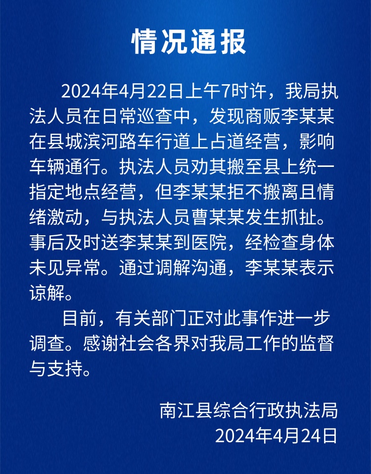 封面新聞報道顯示,24日晚間,南江縣綜合行政執法局一位負責人介紹,事發地點位於縣城濱河路,該地段路面較窄,車流量較大,李某某的攤位當時就在車行道上,影響了車輛通行。為了規範市場,確保城區道路暢通,保持良好市容,有關部門規劃了專門市場,動員、引導流動商販到市場內規範經營,絕大部分商販都有序入駐,執法人員此前也曾多次與李某某溝通,勸其前往指定區域。
