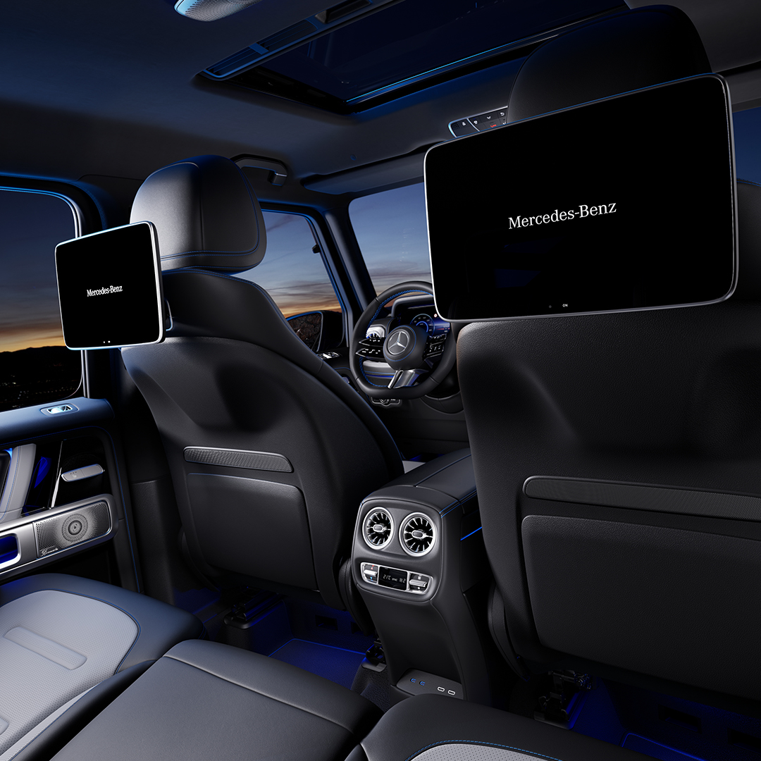 車輛標配第二代MBUX智能人機交互系統,以及12.3英寸高清儀表屏及12.3英寸中央觸控屏,內置的“讀心語音助理”功能全面升級,部分功能支持免喚醒詞啓動,更提供20餘項G級專屬語音指令,為車主帶來更便捷的座艙體驗。相較前代G級越野車,純電G級還優化Burmester 3D環繞立體聲音響系統的揚聲器佈局,新增6個聲道,並在車頂內襯增添一顆帶氛圍燈的揚聲器。