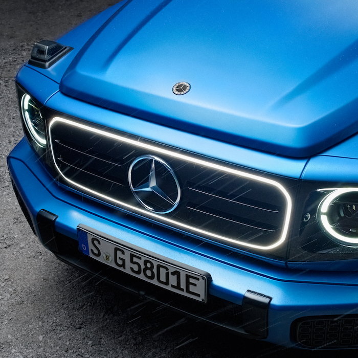 全新G級越野車採用黑色面板散熱器格柵,並以可發光的LED燈帶環繞,在解鎖及鎖止車輛時呈現創新性的動態效果。