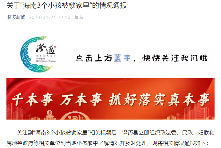 據海南澄邁縣融媒體中心微信公眾號“澄邁新聞”消息,澄邁縣聯合調查組4月24日通報,關注到“海南3個小孩被鎖家裏”相關視頻後,澄邁縣立即組織政法委、民政、婦聯和屬地鎮政府等相關單位到當地小孩家中瞭解情況並及時處理,現將相關情況通報如下: