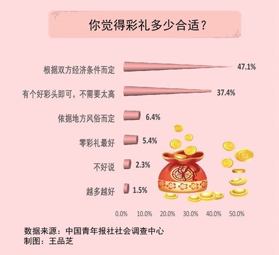 彩禮多少合適?調查中,47.1%的受訪者認為要根據雙方經濟條件而定,37.4%的受訪者認為有個好彩頭即可,不需要太高,6.4%的受訪者認為應依據地方風俗而定,5.4%的受訪者覺得“零彩禮”最好,2.3%的受訪者不好説,僅1.5%的受訪者覺得彩禮越多越好。