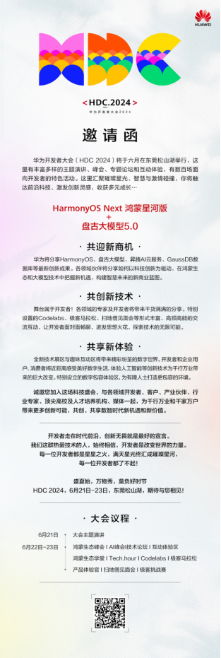 4月25日,華為官方發佈了邀請函,官宣華為開發者大會(HDC 2024)將於6月21-23日在東莞松山湖舉行。從邀請函中可以看出,華為雲即將重磅發佈盤古大模型5.0,並將和HarmonyOS NEXT鴻蒙星河版首次聯袂亮相,這也將成為華為史上規模最大、開發者參與人數最多的開發者大會。這一次,華為雲盤古大模型5.0又將帶來哪些前沿技術升級,終端和大模型如何加速應用,備受業界期待。