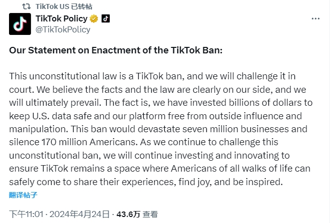 TikTok官方賬號“TikTok Policy”也在X社媒平台同步發佈聲明,誓言通過法律途徑反擊。該公司表示,這項違憲法律就是對TikTok的禁令,公司將在法庭上提出質疑,“我們相信事實和法律顯然站在我們這一邊,我們最終會取得勝利。事實上,我們已投資數十億美元,以確保美國數據的安全,使我們的平台免受外部影響和操縱。”