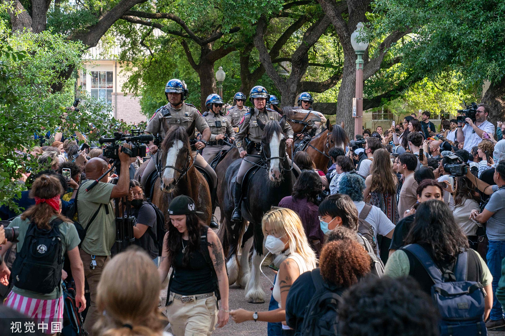 24日,騎警在得州大學校園內驅散示威學生。圖自視覺中國