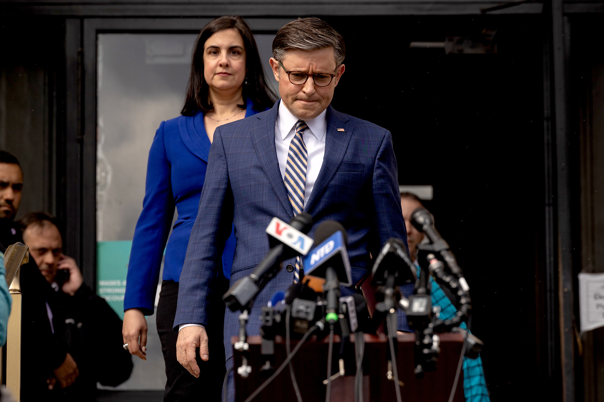 當地時間4月24日,美國眾議院議長邁克·約翰遜在哥倫比亞大學召開記者會 圖自視覺中國