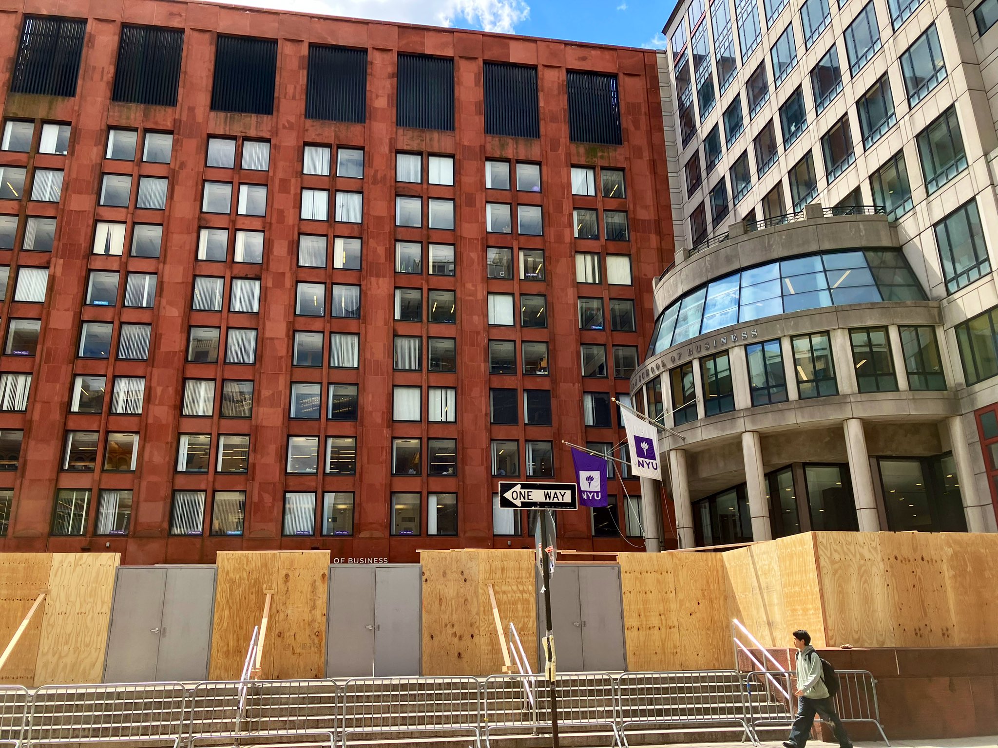 23日,紐約大學建起了膠合板牆。此前該校一直自詡是一個“不設圍牆的校園” 圖自社交媒體X