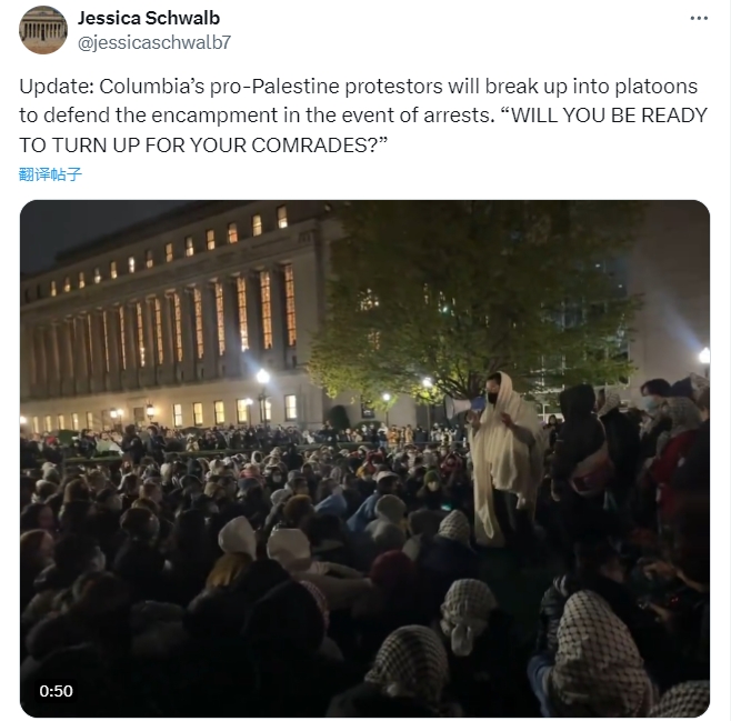 美國哥大挺巴抗議持續,示威學生分組“保衞”營地:準備好為同志們挺身而出了嗎?