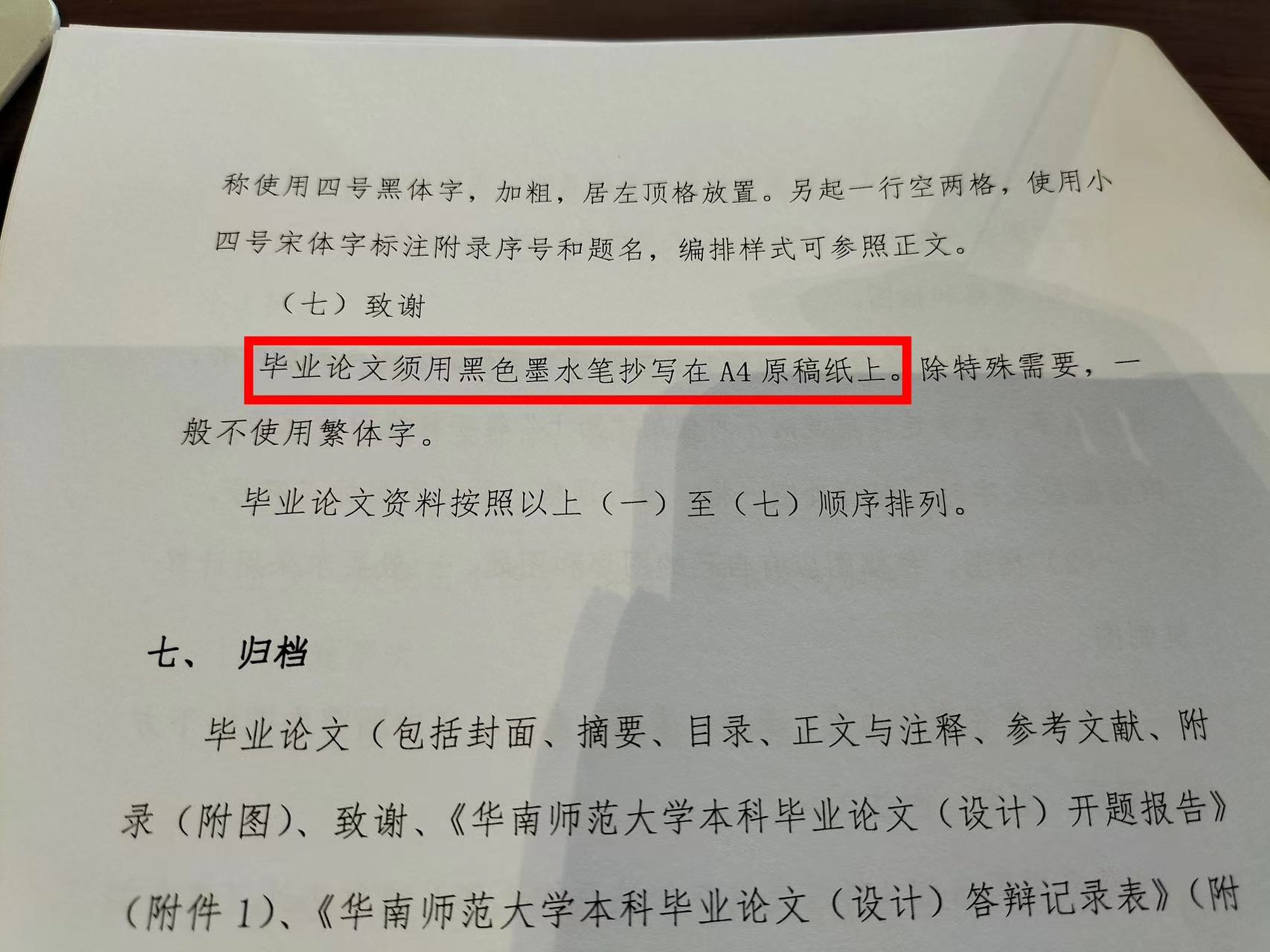 網帖內容稱,華南師大文學院佈置的多達幾個文檔的畢業論文“抄寫要求”包括,抄寫的特定格式紙張需要學生自行打印,每頁400字,起碼需要30+張紙,抄寫的筆出水不能太粗等。