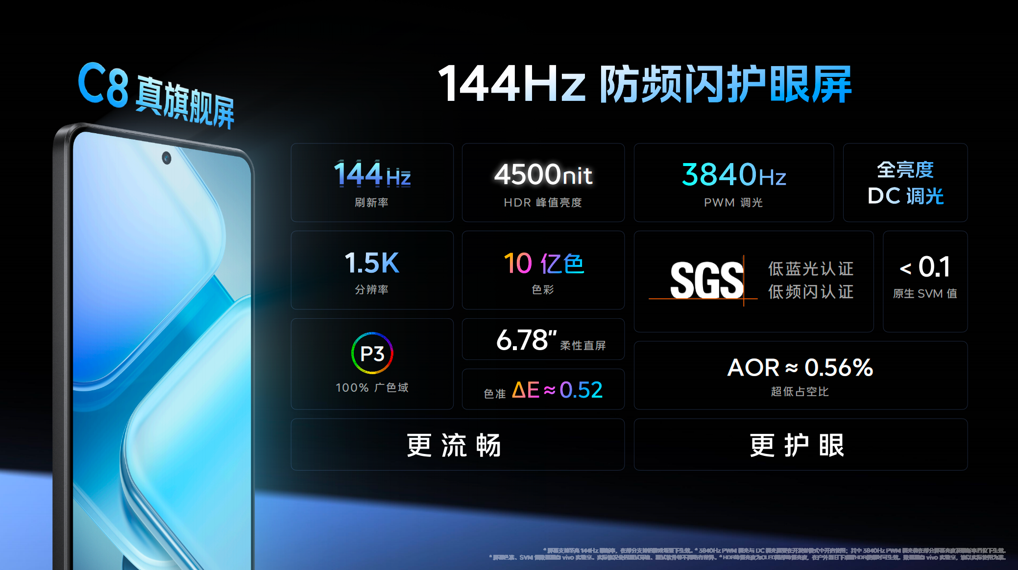 iQOO Z9 Turbo與iQOO Z9 採用了144Hz 超高刷新率的華星 C8 旗艦屏,並通過了SGS 低藍光及低頻閃雙重認證。局部峯值亮度高達4500nit,能夠適應多種環境,局部明暗細節的對比更真實更震撼。144Hz 超高刷新率以及1.5K 分辨率在視覺上更加流暢,並帶來更快的響應速度。作為Z9系列唯一採用LCD屏幕的產品,iQOO Z9x擁有最高120Hz 的七擋變速高刷,全屏最高亮度可達 1000nit ,帶來更強悍的顯示性能和更多的屏幕護眼之選。
