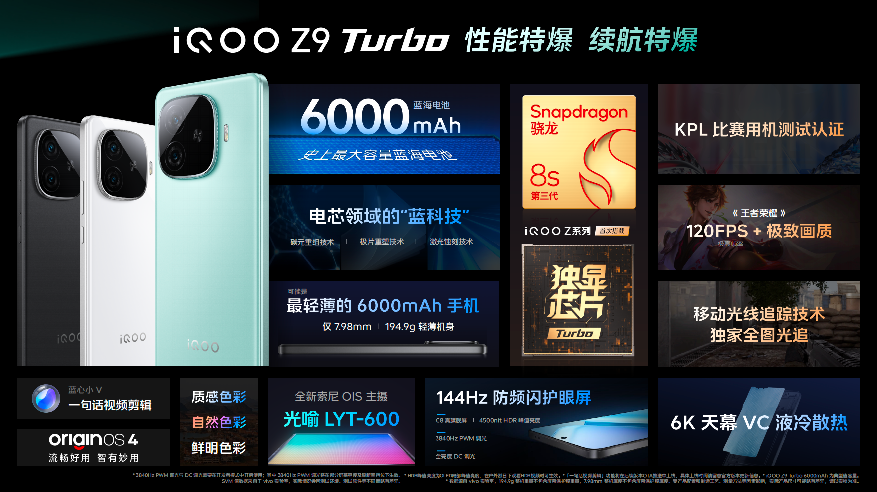 iQOO Z9 Turbo搭載了第三代驍龍8s 移動平台、獨顯芯片Turbo以及6000mAh超薄藍海電池。外觀上,標誌性舷窗設計、主流旗艦同款護眼屏以及全新索尼傳感器等讓其從內到外品質躍升。iQOO Z9採用高通第三代驍龍7移動平台,並搭載了多項 Turbo 同款旗艦配置。而iQOO Z9x 則可以用一句話概括,那就是“性能有驚喜,電量無壓力”。