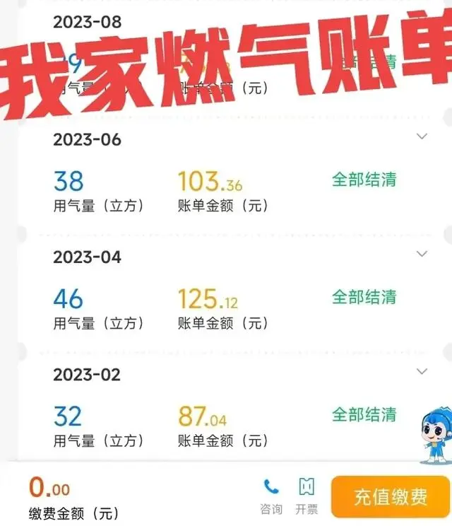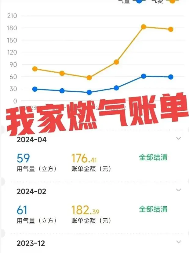 此前這名市民貼出的燃氣賬單顯示,其2023年2月用氣量為32立方,金額為87.04元,2024年2月用氣量為61立方,費用為182.39元;2023年4月用氣量為46立方,費用為125.12元,2024年4月用氣量為59立方,費用為176.41元。