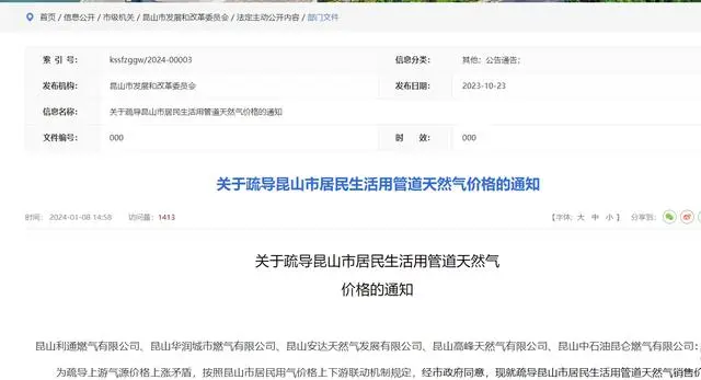 瀟湘晨報記者查閲崑山市政府官方發現,在2023年10月23日,崑山市發展和改革委員會發布了文件《關於疏導崑山市居民生活用管道天然氣價格的通知》。